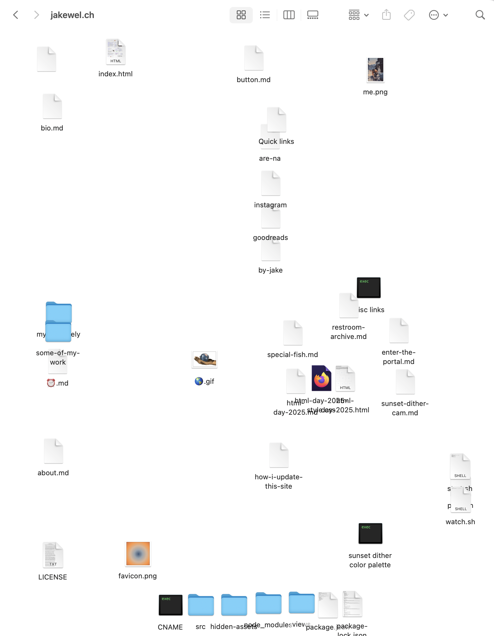 The items on this site and their positions on the webpage are derived from the folders and files in the 'jakewel.ch' folder on my desktop. If you're wondering what that looks like, it looks like this. Notice how they correlate with my webpage!